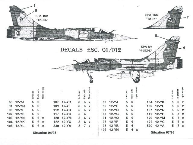 Mit dem vorligenden Bogen bietet sich die Möglichkeit den Mirage 2000 Verband auf der Base Aerienne 108 in Cambrai darzustellen. Der Decalbogen enthält genügend Ziffern und Buchstaben um eine der ca. 43 Maschinen zu Bauen. Wartungshinweise reichen für eine Maschine (-C oder -B). Damit keinerlei Fragen offen bleiben liegt dem Set ein 16-seitiges Heft mit allen erforderlichen Informationen bei. Großformatige Decalanleitungen in der Heftmitte und eine sehr genaue Markierungs- und Bemalungsanleitung für die Waffen sollten keine Fragen offen lassen. Ein wenig Geschichte zu den einzelnen Escadrilles und zahlreiche Bilder des Originals runden die Sache ab. Am Anfang war dieses Set als limitierte Auflage vorgesehen, dies wurde wohl mittlerweile aufgegeben, zumindest liegt jetzt nicht mehr der 1300 Liter Zusatztank für den Unterrumpf aus Resin bei und auch die Nummerierung (Set XXX von 500) fehlt. Der Zeitraum der darstellbaren Maschinen ist 1998, wenn man also eine andere Epoche zeigen will sollte man die Seriennummern prüfen, die Zuordnung von Staffelcode (12-Yx bzw. 12-Kx) und Maschine wechseln permanent, manchmal kommen auch Bustabenkombinationen hinzu oder entfallen.