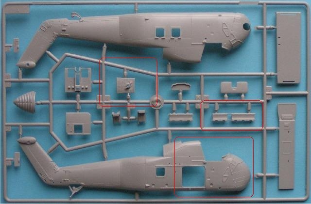 Besprechung:Das OriginalDie Bezeichnung des Bausatzes ist eigentlich nicht ganz korrekt, denn die Version der U.S. Marines führte die offizielle Bezeichnung "HUS-1/UH-34 Seahorse". Den Namen Choctaw führte die Version der U.S. Army "H-34A/CH-34A" (Choctaw ist der Name eine nordamerikanischen Indianervolkes). Nichtsdestotrotz, der Bausatz stellt eine UH-34D mit dem typischen dreirohriegen Abgasstutzen an der linken Seite dar. Doch vorerst zurück zum Original, der UH-34D wurde Anfang 1960 vom U.S. Marine Corps als Ersatz für den H-19 Helikopter eingeführt. Das Modell basiert auf Sikorskys Modell S-58, einem Transporthubschrauber der für den Zivilen Markt entwickelt wurde. Die U.S. Army, auf der Suche nach einem geeigneten Hubschrauber, wurde in dem Modell S-58 fündig, welches ab 1962 die Bezeichnung H-34A erhielt. Neben der U.S. Army fand der robuste Helikopter auch bei der U.S. Navy als HSS-1 Seabat und eben bei den Marines Verwendung. Der Helikopter fand in unterschiedlichen Rollen Verwendung, neben der Variante als Truppentransporter mit 10-16 Sitzplätzen konnte er auch als Rettungshubschrauber mit Platz für acht Tragbahren ausgestattet werden. Die Marines setzten den Seahorse hauptsächlich ab 1962 in Vietnam ein. Neben Aufklärungs-, Transport- und Rettungseinsätzen führten die Helikopter auch Angriffseinsätze zur Unterstützung der Bodentruppen durch. Der UH-34 sah weitere spektakuläre Einsätze bei der Bergung von Raumkapseln u.a. der von Mercury 3, dem ersten bemannten Raumflug der NASA mit dem Astronauten Alan B. Shepard an Bord. Der Seahorse wurde Anfang der 1970 Jahre durch den UH-46 Seaknight ersetzt. In Vietnam stationierte Maschinen wurden der Vietnamese Air Force (VNAF) übergeben. Der BausatzBei einem Vergleich mit Italeris H-34 Baureihe fällt sofort auf, wer für den Bausatz Pate gestanden hat! Die Entwickler von Hobby Boss haben lediglich auf die separaten Bugnase mit den unterschiedlich platzierten Öffnungen für die verschiedenen Varianten verzichtet. Stattdessen sind hier beide Rumpfhälften bereits komplett, natürlich mit der oben angeordneten Öffnung für den dreirohriegen Abgasstutzen. Die Variante mit unten liegendem Stutzen wird in einem zweiten Bausatz "H-34A Choctaw" angeboten. Die an zwei Spritzrahmen befindlichen Bauteile sind sauber gespritzt und weisen auf den Sichtseiten keine Einfallstellen oder Auswerfermarken auf. Die Oberfläche ist sauber und ohne Fehl, die versenkten Gravuren akzeptabel in der Ausführung. Die Rotorblätter weisen bereits die entsprechende Durchbiegung auf und der Rotorkopf ist für den Maßstab ausreichend detailliert. Lediglich der Heckrotor hat, wie auch beim Italeri Modell, die falsche Drehrichtung! Die Außendetaillierung ist gut gelungen und dem Bausatz liegt neben einem Cal. 30 MG und einer 20mm Kanone für die Installation in der geöffnet darstellbare Frachtraumtür auch die Außenwinde sowie diverse Antennen bei.