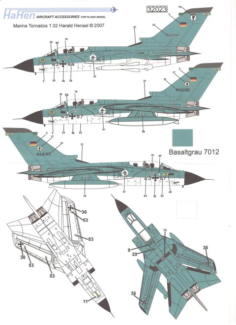 Mit dem Bogen lassen sich Deutsche Marine Tornados im Norm '76 oder Norm '87 Tarnschema bauen. Für das Norm '76 Schema braucht man RAL 7035 Lichtgrau an der Unterseite und RAL 7012 Basaltgrau an der Oberseite. Das Norm '87 besteht aus RAL 5008 Graublau, RAL 7009 Grüngrau und RAL 7012 Basaltgrau.
