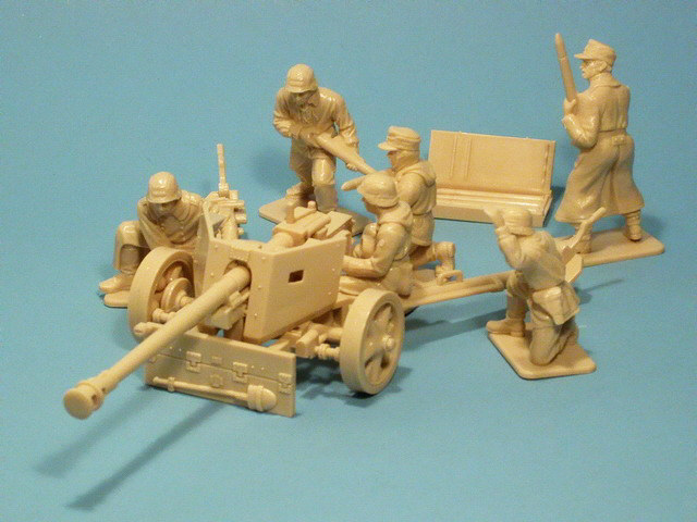 Im Bausatz 2 Spritzlinge aus sandfarbenem Kunststoff mit den Teilen der Pak 40 und 6 Ganzfiguren. Zu Entfernen sind, vor dem Bemalen, die Angüsse an den Teilen und der Grat welcher von der Trennstelle der Spritzgußform herrührt. Anschließend werden die Teile der Pak zusammengesteckt und die Figuren platziert. Fertig.