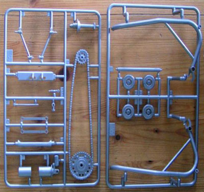 Der vorliegende Bausatz weiß in jeder Beziehung zu begeistern. Angefangen bei der aufwendig gestalteten Verpackung,, die gespannt auf den Inhalt macht, über die schlierenfrei in Blaumetallic gegossenen Spritzlinge der Verkleidung, des Tanks und der Sitzbank, die allenfalls nach dem Aufbringen der Decals mit etwas Klarlack versiegelt werden sollten bis zu den sauber in Silbermetallic lackierten Rahmen und Auspuffteilen. Auch die exakt gearbeiteten Motorenteile, der Lenker mit den Armaturen oder die Bremsscheiben wissen zu gefallen. Auch wurden solche Details wie die Feder für das Zentralfederbein nicht vernachlässigt, eben diese liegt aus Metall gefertigt bei. Alle Bauteile sind gratfrei und ohne übermassig dicke Angüsse ausgeführt. Die beiden beiliegenden sauber gedruckten Decalbögen, ein kleiner für die darzustellenden Carbonteile und ein großer mit Sponsorendecals können voll und ganz überzeugen.
