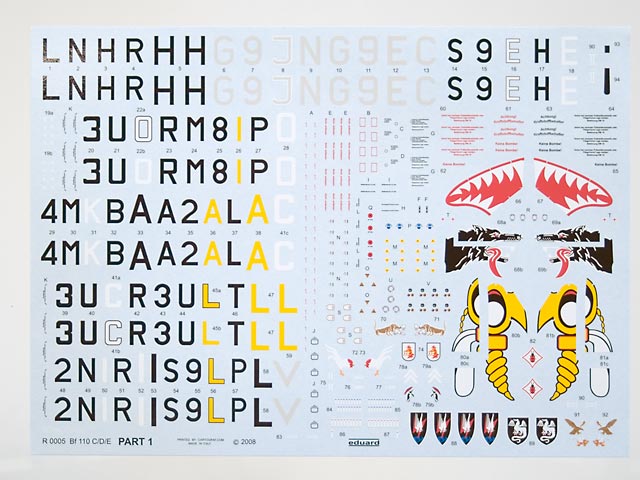 DecalsNicht weniger als zwölf verschiedene Maschinen liegen als Decaloption dem Kit bei. Dabei werden alle typischen Einsatzbemalungen bis zur Variante E berücksichtigt, inklusive zweier schwarzer Nachtjäger. Die Abziehbilder glänzen, sind dünn und sehr genau gedruckt. Hin und wieder findet man auf Abziehbildern ausländischer Hersteller Rechtschreibfehler. Nicht so bei Eduard - auch ein Ausdruck der Sorgfalt, mit der man bei Eduard zu Werke geht.