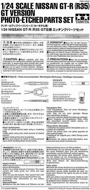 Als Ergänzung zu den beiden Nissan GR-R R35 GT Bausätzen hat Tamiya ein separates Detaillierungsset auf den Markt gebracht. In dem Set sind Gurtätzeile und selbstklebende bedruckte Gurte enthalten, die durch die im Bausatz enthaltenen Decals ausgetauscht werden. Des Weiteren können die vorderen und hinteren Gitter durch Ätzteile ausgetauscht werden, sowie auch die Bremsscheiben. Zur weiteren Detaillierung liegen dann noch diverse Verschlüsse für das Modell bei. Für die Reifenbeschriftung liegt eine Lackierschablone bei, mit der man den Schriftzug mit Hilfe der Airbrush auflackieren kann. Zwei gedrehte Aluteile verfeinern noch die Auspuffrohre und eine Antenne nebst der Halterung liegt ebenfalls noch dabei.