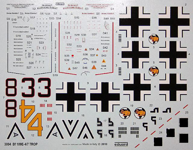 Die VorbilderEduard beschränkt sich hier auf die I./JG 27 im Frühjahr/Sommer 1941 in Lybien. Das soll aber nicht heißen, dass die angebotenen Varianten nicht farbenfroh sind/ausfallen können. Neben der allseits PK-bekannten "Schwarzen 8" sind hier die nicht minderbekannte "Schwarze 3" in der Übergangstarnung gewählt. Was fehlt, sind die "einfarbigen" Maschinen des JG 27 (Franzisket u. a.). Auf die bestehenden Interpretationsunterschiede zwischen E-4/trop und E-7/trop zu den jeweiligen Vorbildern möchte ich hier nicht eingehen, da der Bausatzinhalt beide "Auslegungen" des umsetzenden Modellbauers zulässt.