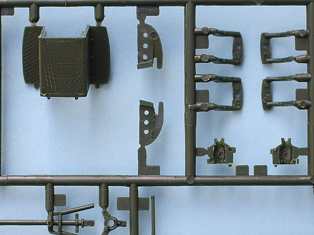 Da ist er wieder, Revells altbekannter Teppichklopfer im kleinen Maßstab. Die 115 Einzelteile verteilen sich auf vier in olivgrünem Plastik gefertigte Gussrahmen. Erwartungsgemäß hat sich an der 2010er Wiederauflage bis auf die Decals nichts geändert. Die bewaffnete Urversion des UH-1D enthält wieder denselben extra Rahmen mit den "SAR" Teilen, wobei sich das SAR lediglich auf einen Stapel Krankenbahren beschränkt. Irgendwelche medizinische Austattung, die das Decal "Notarzt" rechtfertigen würde, fehlt komplett. Somit sind natürlich auch die Markierungsvarianten teilweise Makulatur. Hier hilft nur selbst anfertigen bzw. Restekiste plündern. Der Bausatz selbst ist schon etwas älter und zählt nicht gerade zu den ultimativen Glanzlichtern im Revell-Formenfundus. Die Oberflächendetails bestehen - abgesehen von den Türen - aus erhabenen Gravuren mit mehr oder weniger überzeugend wirkenden Lüftungsschlitzen und -gittern. A propos, die relativ prominenten Schlitze dirket hinter dem Hauptrotor sind senkrecht angeordent, nicht waagerecht wie im Bausatz. Im Bauplan ist's kurioserweise richtig dargestellt. Zahlreiche Anbauteile wie z.B. Antennen, Kabelschneider, Lasthaken, Leuchten usw. werten den Außenbereich ungemein auf.