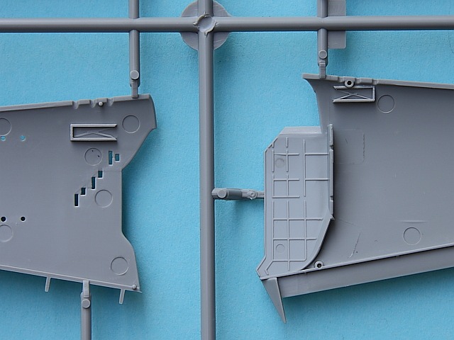 Weiter geht's mit dem Fahrwerk, auch hier ist die Detaillierung in Ordnung. Im Gegensatz zu den früheren Baumustern sind die Räder für diese Variante korrekt. Die Fahrwerksschächte sind mit erhabenen Strukturen versehen und auf, wenn nicht sogar über dem Niveau der Konkurrenz. Aufgrund der beigeklappt baubaren Tragflächen ist dieser Bereich besonders gut einsehbar. Ärgerlich sind hier einige ungünstig gelegene Auswerferspuren, die mühsam entfernt werden müssen. Die Tragflächen selbst können wie schon erwähnt im gefalteten Zustand gebaut werden. Die Methode der Fixierung am zentralen Mittelstück ist nahezu idiotensicher, der Abstand zum Rumpf und Winkel ergeben sich durch die Teile automatisch. Die Landeklappen sind separat ausgeführt und können entsprechend ausgelenkt gebaut werden. Seiten- und Höhenruder bieten diese Option nicht. Die bei den früheren Hellcat Bausätzen von Hobby Boss bemängelten fehlenden Kanonenmündungen sind auch hier nicht vorhanden, zumindest die 20 mm Kanonen sind an dem F6F-5N Spritzling dran, somit sind nur noch ein Teil der Läufe selbst beizusteuern. Die Zuladung besteht aus dem obligatorischen 150 Gallonen Zusatztank, zwei 500 Pfund Bomben und sechs 5 Inch HVAR Raketen.