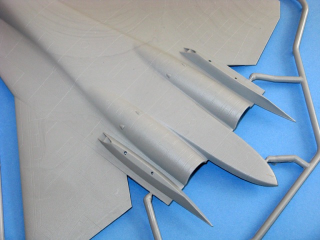 Alle Spritzgussteile vermitteln im Grunde einen anständigen Eindruck. An Oberflächendetails mangelt es nicht, zahlreiche akkurate vertiefte Gravuren und sauber ausgearbeitet Teile erfreuen das Auge. Irgendwie sind alle diese Stealth-Fighter aus dem gleichen Holz geschnitzt! Sie sind flach wie eine Flunder, wobei der Rumpfrücken beim Modell den Augenschein erweckt, dass er etwas zu ausgeprägt ausgefallen ist. Die Schubdüsen sind meiner Meinung nach gelungen, aber beim Original sind die schwenkbar. Hier sollte man selbst die Initiative ergreifen. Einige Öffnungen am Rumpf sind fiktiv durch Abziehbilder darstellbar. Auch hier werden wohl erfahrene Modellbauer nicht scheuen, all diese Kleinigkeiten zu verbessern. Die Turbinenlufteinlaufe sind etwas komplex aufgebaut, wie gut diese Teile insgesamt passen und ein ordentliches Bild abliefern, bleibt offen. Ich hoffe jedoch, dass die Anpassungmaßgerecht ausfällt. Ein Waffenschacht existiert nicht, und somit auch keine Bewaffnung. Es sind noch zu wenig Details von diesem neuen Jet bekannt.
