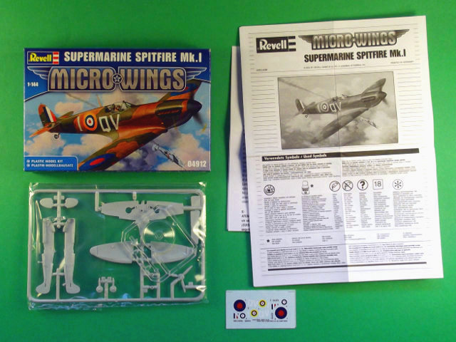 Revell liefert in der Micro-Wings Reihe eine ganze Serie von WW2 Flugzeugen im kleinen Maßstab mit überschaubarer Teileanzahl. So auch die Spitfire Mk.1, zu der ich im Original nichts sagen möchte. Die Bausätze werden durchweg im kleinen Schub-Karton ca. 9,5 cm x 14,5 cm geliefert. Im Karton befinden sich die zusammen in einer Folietüte verpackten Spritzlinge und die einzeln beiligende Bauanleitung, Sicherheitspackzettel sowie ein kleiner Bogen Nassschiebebilder.