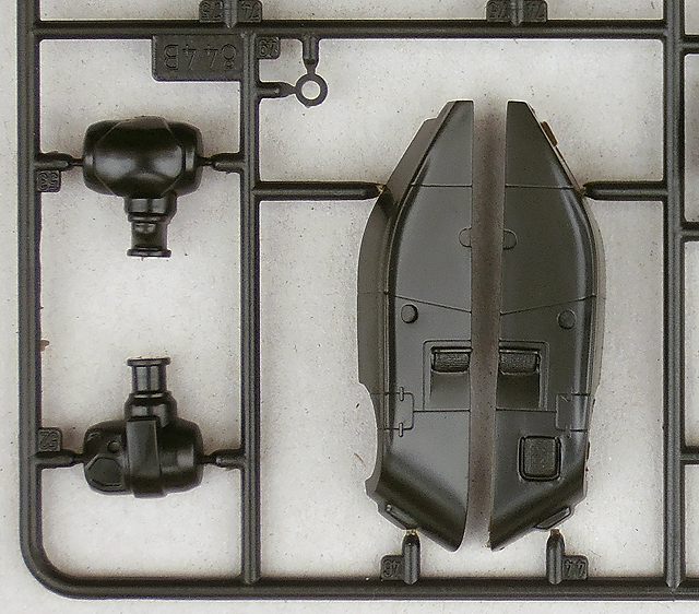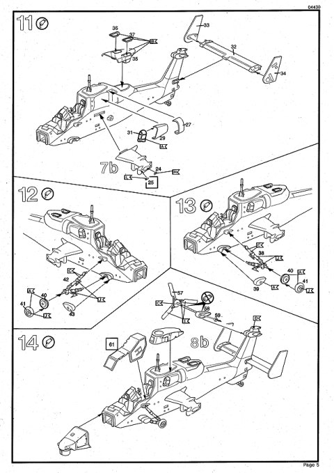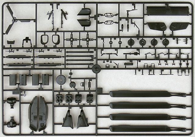 Der BausatzDieser Bausatz stammt aus dem Jahr 1995 und ist derzeit nicht Bestandteil des aktuellen Revell-Programmes. Allerdings kann man den Bausatz in Online-Auktionshäusern relativ leicht und günstig erwerben. Er ist in der Revell-üblichen Faltschachtel verpackt, die die in einem Kunststoffbeutel eingeschweißten Teile für den Bau einer Vorserienmaschine enthält. Die beiden Rahmen sind in dunkelolivgrünem Plastik sauber und ohne Fischhäute abgespritzt, Auswerfermarken oder Sinkstellen in sichtbaren Bereichen findet man keine. Bei den separat verpackten und schlierenfrei gefertigten Klarsichtteilen fällt eine ungleichmäßige Materialstärke auf, so dass sich ein verzerrter Einblick ins Cockpitinnere ergeben kann. Die Rumpfteile sind allesamt sauber wiedergegeben, werden von einer Mischung aus feinen versenkten und erhabenen Gravuren und Nietenreihen verziert und ergeben einen stimmig nachgebildeten Außenbereich. Recht gut nachgebildete Fahrwerksbeine und eine Vielzahl von Kleinteilen runden das Bild für einen insgesamt schön detaillierten Hubschrauberrumpf ab. Leider setzt sich die Teilequalität bei Rädern, Außenlasten sowie Haupt- und Heckrotor nicht fort. Diese Baugruppen sind sehr einfach gehalten und könnten wesentlich ausgeprägter detailliert und durch eine größere Anzahl von Einzelteilen besser nachgebildet sein. So besteht beispielsweise der bei diesem Helikopter sehr aufwändig konstruierte Heckrotor im Modell nur aus einem einzigen Teil, das aus nur zwei Teilen bestehende Mastvisier wird weder durch Klarsichtteile noch durch Decals aufgewertet. Die kleinen Schiebefenster auf der seitlichen Cockpitverglasung sind ebenfalls nicht nachgebildet.