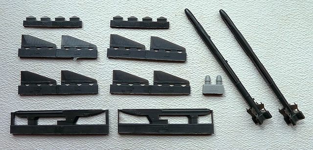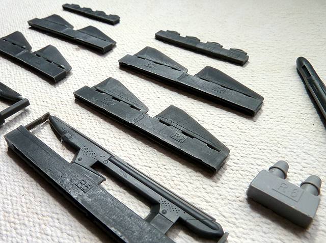 Der Decalbogen und die kleine ÄtzteilplatineÜbersicht über die enthaltenen Resinteile. Beachte die aus hellgrauem Material dargestellten Schutzkappen.Raketen und Pylone in zusammengesetztem Zustand (Grafik: Eduard)Raketen ohne Pylone (Grafik: Eduard)Die Resinteile im Streiflicht. Beachte die feinen Gravuren.Die Resinteile im Streiflicht. Beachte die feinen Gravuren.