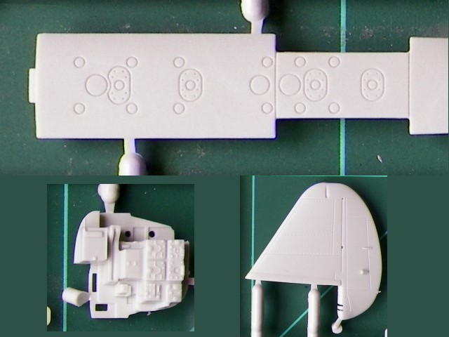 BesprechungDie Qualität der Spritzrahmen ist hervorragend und bereits aus dem A-4-Bausatz bekannt. Die Teile sind sauber gespritzt, Grat oder Fischhäute sind nicht zu finden. Die Gravuren sind fein versenkt, jedoch etwas intensiver als bei Hasegawa oder Zvezda. Besonders gelungen finde ich, wie auch schon bei der A-4 erwähnt, die Lösung des Rumpfrückenteils. Die tollen Strkturen der Tankverschlüsse auf dem Rumpfrücken verschwinden so nicht mehr durch notwendige Schleifarbeiten, wie es bei der herkömmlichen Rumpfhälftenspritzung der Fall ist. Auch das Zusammensetzen der Fahrwerkgondeln entlang der Klappenstruktur ist sehr gelungen. Auch hier werden durch Schleifarbeiten keine Strukturen zerstört. Vergleiche mit mir zur Verfügung stehenden Zeichnungen ergeben sich stimmige Strukturen, Blechstöße und Abmessungen. Lediglich die leichte Ausbuchtung der Fahrwerkgondeln ist nicht vorhanden. Neben dem sehr detaillierten Cockpit und der wahrscheinlich recht kniffligen Bugsektion liefert Revell für die Bugbewaffnung nicht einfach nur Plastikstäbchen sondern schöne MG- und Kanonen-Nachbildungen. Mit etwas Nacharbeit könnte man die Maschine auch mit abgenommener Bugspitze darstellen. Sogar in der Cockpit-Ausstattung wurde die Nachtjäger- und Zerstörerversion berücksichtigt: so ist der Platz des Copiloten entsprechend gestaltet und auch an das Radargerät für das FuG202/212 ist gedacht. An dieser Stelle hat Revell eindeutig die Nase vorn und Hasegawa definitiv Nachholbedarf. Ebenfalls mit verschiedenen Teilen wird der Bereich vor und hinter dem Cockpit gestaltet und so den verschiedenen Bedingungen (mit und ohne zusätzliche Panzerung, einfacher oder doppelter B-Stand) angepasst.