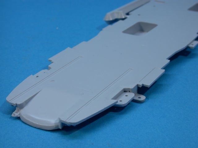 Trotz des Alters der Formen sind die grauen Plastikteile durchaus brauchbar gespritzt, wenn auch der eine oder andere "Flash" zu entfernen ist. Auch finden sich hier und dort den Bau erschwerende Sinkstellen und Auswerfermarken. Die Teile sind - wie das seinerzeit Standard war - teilweise deutlich vereinfacht wiedergegeben, aber die Grundform des Schiffes ist in Ordnung.