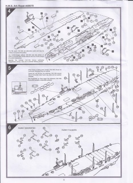 Ein Farbprofil mit Hinweisen auf die beigelegten acht Humbrol-Acrylfarben komplettiert die Bauanleitung. Dieses umfasst auch die Farbgebung der Bordflugzeuge vom Typ Swordfish und Fulmar. Leider liegen dem Bausatz keine Decals bei, weder für das Schiff noch für die Bordflugzeuge. Für mich nicht nachvollziehbar ist die Farbgebung des Flugdecks in Grün. Meines Wissens nach (und laut der diversen Modellbaukollegen, mit denen ich mich schon über das Thema ausgetauscht habe), sollte hier ein dunkles Grau zum Einsatz kommen. Die Rumpffarbe sollte für den Beginn des Krieges ein mittleres bläuliches Grau, AP 507B, sein, und für den Einsatz im Mittelmeer ein deutlich helleres Grau, AP 507 C.