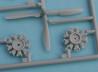 Der Motor ist vollständig nachgebildet mit dem passenden Getriebegehäuse für den späten PW-2800-57, welches sich ja deutlich von den früheren Versionen unterscheidet. Mit ein paar Zündkabeln lässt sich der Motor nochmals ordentlich aufbrezeln. Besonders interessant sind die bereits leicht geöffnet dargestellten Kühlklappen rund um die Cowling, diese sind selbst in größeren Maßstäben meist nur geschlossen baubar. Allerdings sind diese auch sehr empfindlich und lassen sich bei Bruch nicht wirklich gut wieder ankleben. Werfen wir einen Blick auf den Fahrwerksbereich. Die filigranen Fahrwerksbeine brauchen lediglich noch ein paar Bremsleitungen, die einteiligen Reifen mit Felgen im 6-Speichen-Design verfügen über ein dezentes Längsrillenprofil. Für Freunde eingezogener Fahrwerke hat Revell die Fahrwerksklappen an einem Stück gegossen, was diese Option etwas erleichtert. Alle anderen müssen die Teile zuerst zerteilen. Auf der Innenseite findet sich ein ärgerlicher Auswerfer der wegen der vorhanden Details nur schwierig zu entfernen ist. Die Schächte verfügen über eine ausreichende Tiefe und eine ordentliche Detaillierung. Auch hier reichen ein paar Leitungen als Ergänzung völlig aus.