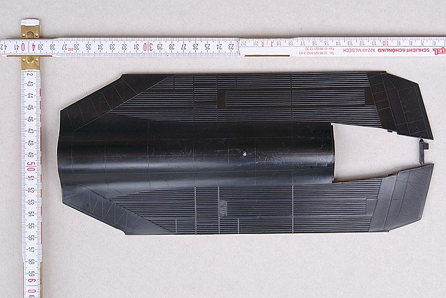 Öffnet man den 45 x 27 cm großen Stülpkarton fallen einem die vielen, teilweise sehr großen Teile der Triebwerksgondeln und des stark zergliederten Rumpfes auf. Allesamt recht sauber aus schwarzem Kunststoff gefertigt, weisen sie feine erhabene Gravuren auf. Sinkstellen oder Auswerfermarken in sichtbaren Bereichen findet man an diesen Teilen nicht, allerdings sind, was sicher am Alter meines Bausatzes liegt, einige Teile ziemlich verkratzt. Passproben haben gezeigt, dass die Rumpfteile verzugfrei und recht sauber zusammenpassen. Natürlich gibt es Nahtstellen, die aber verhältnismäßig gering ausfallen, gut zugänglich sind und sich relativ einfach verspachteln lassen dürften. Teilweise sind die Nahtstellen an Ober- und Unterrumpf versetzt, so dass sich hier eine recht stabile Konstruktion ergibt. Um eine saubere Passung der Rumpfteile zu erhalten, halte ich es für empfehlenswert, Abstandshalter zwischen Ober- und Unterteilen einzusetzen. Die Sensorbuchten sind verglast, dahinter herrscht allerdings gähnende Leere. Für den hinteren Cockpitplatz gibt es eine Alternative: Hier sind Teile für den Bau des "Standardcockpits" der A-Version oder des erhöhten Cockpits der B-Version vorhanden.