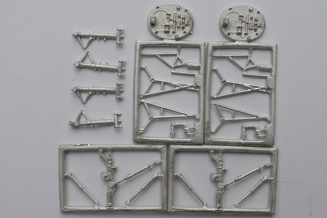 Für den kürzlich erschienenen Doppel-Bausatz von Kinetic ist dieses Set gedacht. Es umfasst das komplette Fahrwerk und das vordere Schott an dem das Bugfahrwerk montiert wird. Da dem Originalbausatz zwei Modelle beiliegen, bekommt man auch hier zwei komplette Sets in einer äußerst unpraktischen Einweg-Blister Verpackung (für Batterien ok aber hier...). Der Guss der jeweils 10 Einzelteile ist sehr sauber, es muss nur minimal Grat entfernt werden. Etwas unglücklich gelöst sind die Angüsse für die beiden Hydraulikzylinder (Einzugsstreben) des Hauptfahrwerkes, dessen "Öse" etwas nachgearbeitet werden muss. Die Oberfläche der Teile ist ein wenig zu rau um die Teile unlackiert zu verwenden. Praktisch ist natürlich, dass man die polierten Teile der Hydraulikzylinder ohne großen Aufwand sehr realistisch darstellen kann. Die Detaillierung der Fahrwerke liegt in etwa auf dem Niveau der Bausatzteile. Einen wesentlichen Vorteil gegenüber letzteren ist natürlich der Zugewinn an Stabilität. Eines der Hauptfahrwerksbeine ist bei meinem Set verbogen.