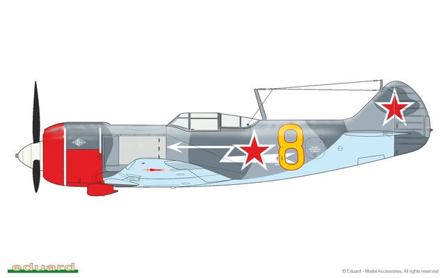 • LA-5FN, P. Rakov, Sommer 1944 – gelbe oder silberne 8 (alternative Ziffern sind dabei), Blitzmotiv, rote Cowling.