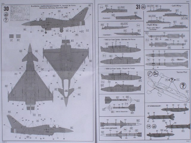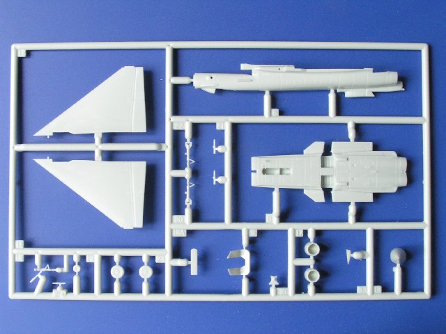 Nachdem bereits 2010 die einsitzige Variante des Eurofighter auf den Markt kam, musste die geneigte Modellbaugemeinde bis jetzt auf den Doppelsitzer warten. Da die Entwickler bei Revell sich bereits im Vorfeld Gedanken gemacht haben, wie die zweisitzige Variante ohne neue Formen für die Hauptbauteile umzusetzen ist, enthält der hier vorliegenden Bausatz lediglich nur drei neue Spritzrahmen. Ein Spritzrahmen enthält ein neues Rumpfrückenteil sowie das hintere Cockpit samt Sitz, ein zweiter Spritzling enthält die Luft-Boden Lenkwaffen Taurus (Bundesluftwaffe) und Stormshadow (RAF). Bleiben noch neue Klarsichtteile für die größere Cockpitkanzel. Die Bauteile sind für den Maßstab sehr fein detailliert und verfügen über fein versenkte Gravuren. Leider setzt sich die Detaillierung im Cockpit nicht fort, hier ist zwar alles Wesentliche vorhanden, nur fehlt eine Struktur auf Paneelen und Instrumentierung. Die Cockpitverglasung ist zweiteilig ausgeführt und kann daher auch geöffnet dargestellt werden. Ein kleiner Wermutstropfen, die Kanzel Bauteile liegen ohne weitere Verpackung und Schutz zusammen mit den anderen Spritzrahmen in einem Klarsichtbeutel. Eine separate Verpackung wäre wünschenswert, um die dünnen und schlierenfreien Teile vor Zerkratzen zu schützen!