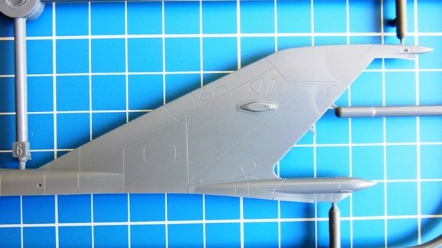 Nun zu den Bausatzteilen. Alle zeichnen sich durch feine, scharfe und nicht übertriebene Oberflächengravuren aus. Bei den Tragflächen fällt die ungewohnte Aufteilung ins Auge. Das Seitenleitwerk macht einen stimmigen Eindruck. Alle Klappen und Ruder sind separat ausgeführt, so dass man die Maschine auch mit ausgelenkten Klappen darstellen kann. Die schlanke, runde Rumpfform ist originalgetreu gestaltet. Das Cockpit besteht aus ca. 20 Teilen und ist hervorragend wiedergegeben. Optional kann man für das Modell noch die Eduardteile Nr. 48702 und 49571 verwenden. Das Instrumentenbrett ist als Transparentteil ausgeführt und präzise wiedergegeben. Die Kanzelverglasung ist sauber und transparent dargestellt. Der Schleudersitz (ebenfalls ca. 20 Teile) ist ausreichend detailliert, wer möchte kann ihn natürlich ersetzen, was aber eigentlich nicht erforderlich ist. Der Fahrwerkbereich ist mit seiner Detailfülle konkurrenzlos. Der Triebwerksauslass ist einfach aber ausreichend detailliert. Interessant ist die mit dem Modell darzustellende Maschine mit ihrem schwarz-weiß und grauen Tarnanstrich. Als Decals liegt ein kleiner Bogen mit dem Nötigsten für die Einheiten und Landeskennung bei. Ebenso sind Decals für das Cockpit vorhanden. Wer möchte kann auch hier noch mit einem Stencilset nachgestalten.