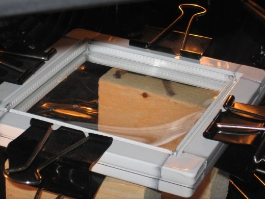 Wenn der Autor in die Küche zieht, den Backofen einschaltet und freiwillig(!) den Staubsauger in Beschlag nimmt, dann kann dies nur eines bedeuten - es wird mal wieder Kunststoff verformt. Immer wieder liest man in Bauberichten von selbstgezogenen Cockpitkanzeln. Doch wie genau funktioniert Vacuforming / Tiefziehen? Zunächst benötigt man einen Vacukasten. Hierbei handelt es sich meist um einen Holzkasten, dessen Innenraum luftdicht ist, der an einer Seite eine gelochte Arbeitsfläche hat und einen Anschluß für einen Staubsauger der gehobenen Leistungsklasse (der Akkusauger für’s Auto reicht leider nicht). Der hier gezeigte Vakuumkasten ist ein Produkt der Firma Kingston Vacuform aus den USA. Der Lieferumfang der Vacukästen dieser Firma umfasst den handgefertigten Kasten aus Holz, einen 2teiligen Rahmen aus Aluminiumprofilen, vier Klammern zum Fixieren des Rahmens und eine Auswahl an verschiedenen Kunststoffplatten. Das hier verwendete Modell mit der Bezeichnung Canopy Master bietet eine Arbeitsfläche von 8,9 x 8,9 cm und ist das kleinste Modell aus dieser Produktreihe.